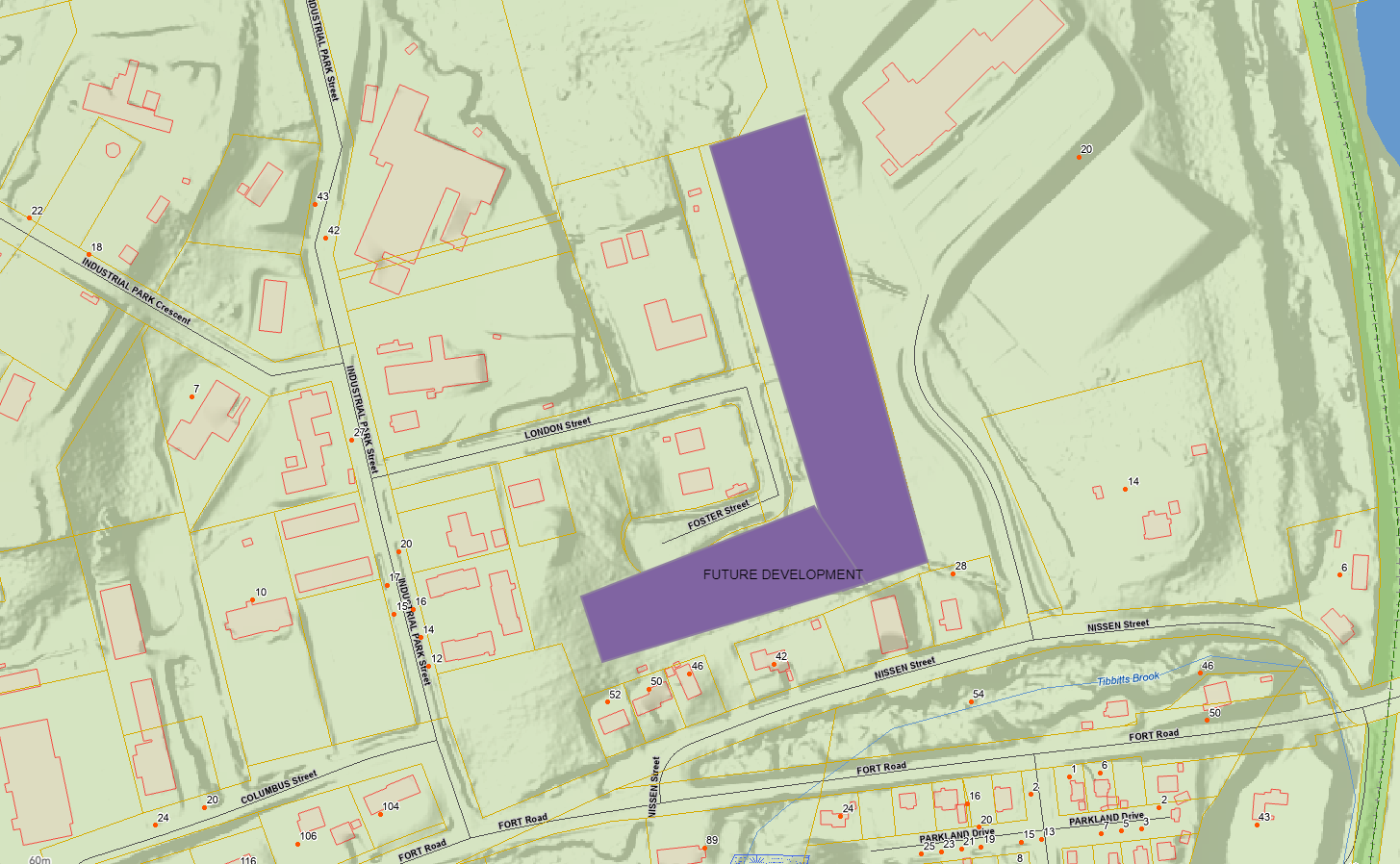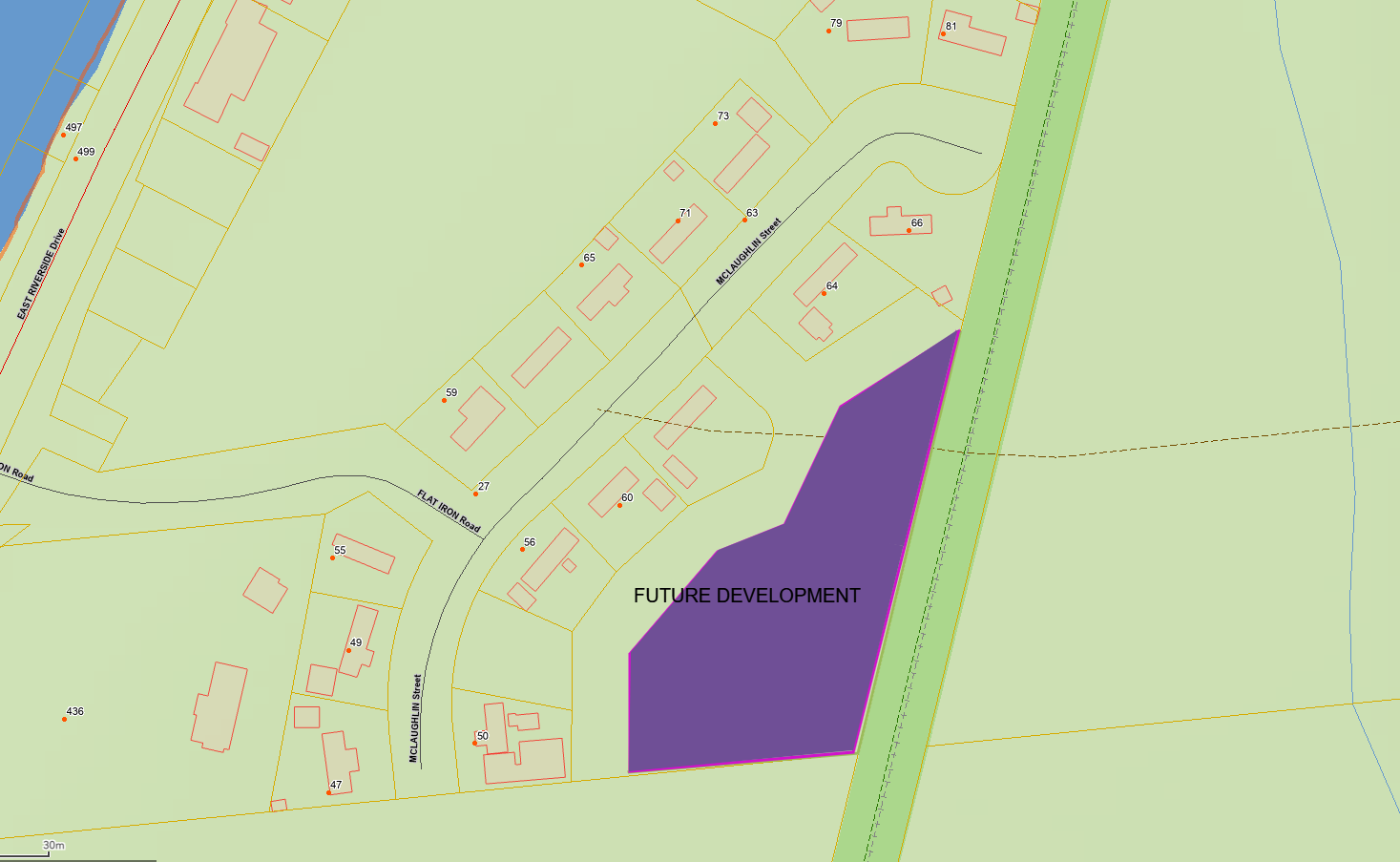 Flat Iron Subdivision - development will be for vacant land between McLaughlin St (behind the existing homes) and the NB Trail. The municipality will install the roadway and utilities to these properties. Acceptable housing development will include single home units.